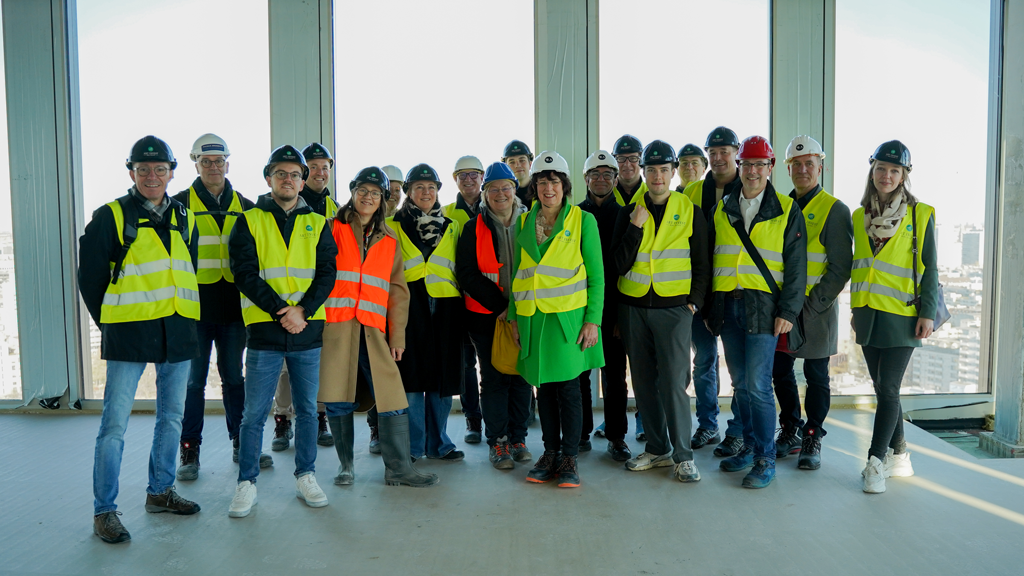 Der zweite Tag der Reise begann im Zeichen der Baupraxis: Ausgerüstet mit Bauhelm und Signalweste ging es auf die Baustelle des ehemaligen Westberliner Postbank-Towers, das Projekt M50. Zwei Architekt:innen des verantwortlichen Architekturbüros Eike Becker_Architekten führten durch die komplexe Sanierung des Gebäudes und verdeutlichten, wie Bestandserhalt und Innovation ineinandergreifen können. Sie hoben besonders die in die Fassade integrierte Photovoltaikanlage hervor, die künftig die größte PV-Fläche Deutschlands an einer Gebäudefassade bilden wird. Die Teilnehmenden, die sich mit dem Baustellenaufzug bis in die oberen Geschosse wagten, wurden mit einem beeindruckenden Blick auf die Berliner Skyline belohnt.