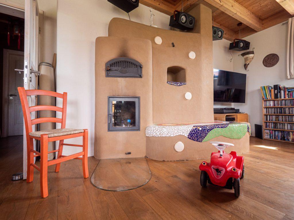 Die Reihe der ökologisch hochwertigen Baustoffe setzt sich im Haus der Ramhorsts fort: Schaumglasschotter für das Fundament, Zwischenwände mit Kalksandsteinen, Böden aufgebaut mit Grünlingen und belegt mit Holzdielen, aus Holz auch die Fensterrahmen. Der Clou ist ein Grundofen mit Sitzbank, der unter der ins Obergeschoss führenden Treppe gebaut wurde. Mit seinen wärmeabführenden Rohren und Schläuchen reicht er aus als einzige Wärmequelle des Hauses und hat auch obendrein ein Fach fürs Pizzabacken. Die Idee des Grundofens kam vom Architekten, Jens Ramhorst hat begeistert mit daran gebaut. Nach einem Ofenbaukurs versteht sich. Für die bunte Verfliesung war wieder Lisa Ramhorst aktiv. Ressourcen schonend ist auch die Strom und Warmwasserversorgung: Die Photovoltaikanlage ist gerade auf 15 Kilowatt erweitert worden und ersetzt damit die bisherige Solarthermieanlage.