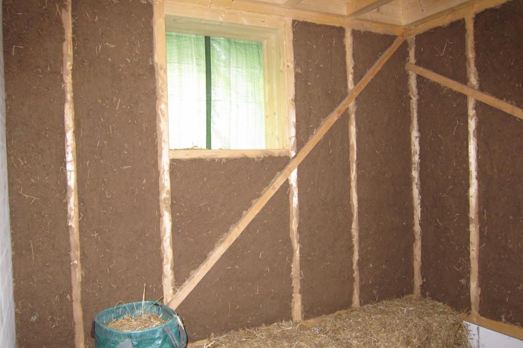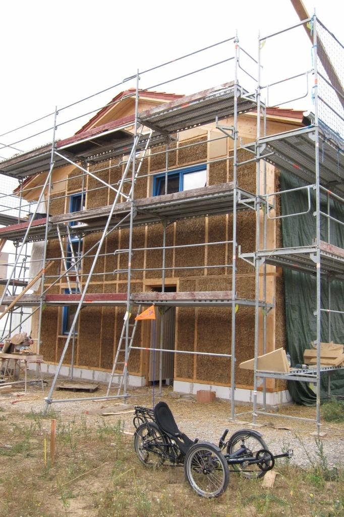 Dass am Ende mindestens 60 Prozent Eigenarbeit in den Hausbau geflossen sind, macht sie heute noch stolz und zufrieden. Mit fachlicher Anleitung kann das Einbringen von Strohballen in die Fächer des Holzständerwerks auch von Laien ausgeführt werden, es dauert bloß einiges länger, als wenn Profis das machen. Wichtig ist auch eine gute Qualität des Strohs, die Halme dürfen beim Dreschen nicht zerstört werden. Ein bereits darin erfahrener Bauer in Bredenbeck konnte die Ballen in der gewünschten und vor allem gleichmäßigen Größe liefern. In einer regenfreien Wetterphase wurden sie dann mit Körperkraft und großem Holzhammer in die Fächer gepresst. Die Ballen müssen dicht komprimiert sein, damit wenig Sauerstoff in ihnen ist, das hält nicht nur Insekten oder Feuchtigkeit draußen, sondern dient auch dem Brandschutz. Baustrohballen sind ein zugelassener Baustoff mit Brandschutzfaktor F90 und mit einer Wärmeleitfähigkeit, die die aktuellen Anforderungen an Wärmeschutz übertrifft. Als Nächstes erhalten die Strohwände außen und innen in mehreren Durchgängen Lehmputzschichten, die in den Innenräumen gestrichen werden können. Die Außenfassade mit einer Dämmstärke von 40 Zentimetern wurde in Hiddestorf abschließend mit Kalkputz geschützt.